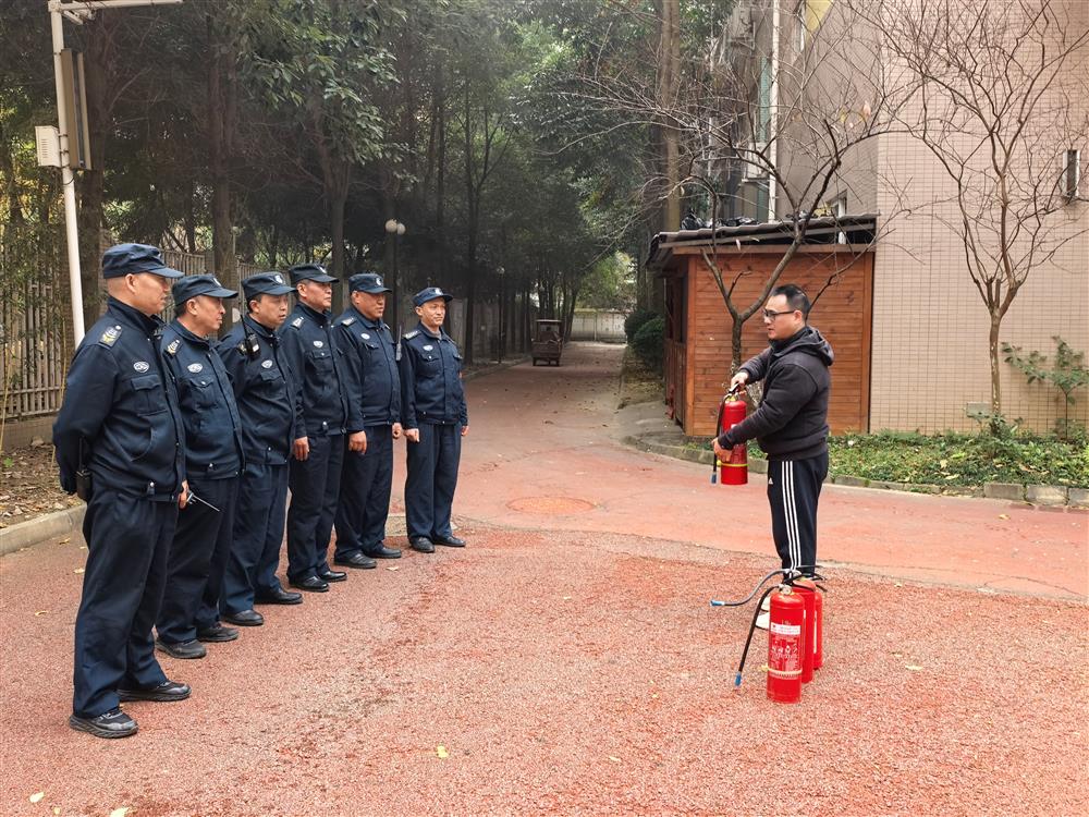 在实操环节,安保人员依次上阵,熟练完成灭火器操作,成功扑灭模拟火源,动作标准连贯。演练全程紧凑有序,各环节衔接流畅,充分检验了安保团队的快速响应与协同作战能力。